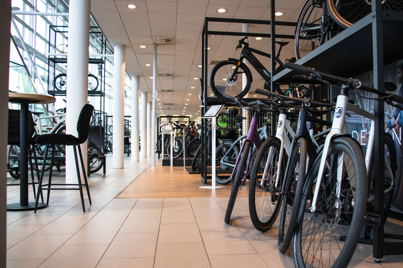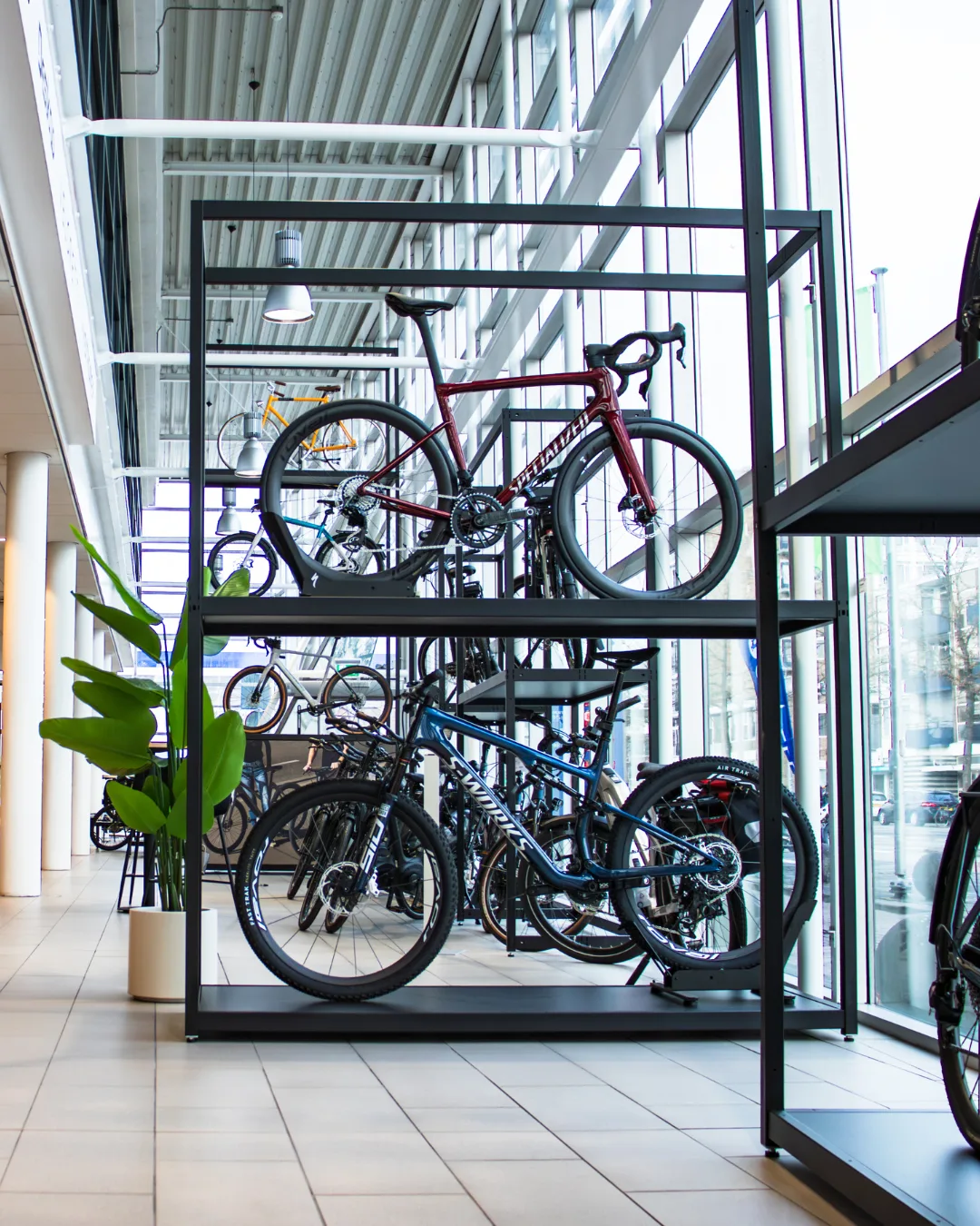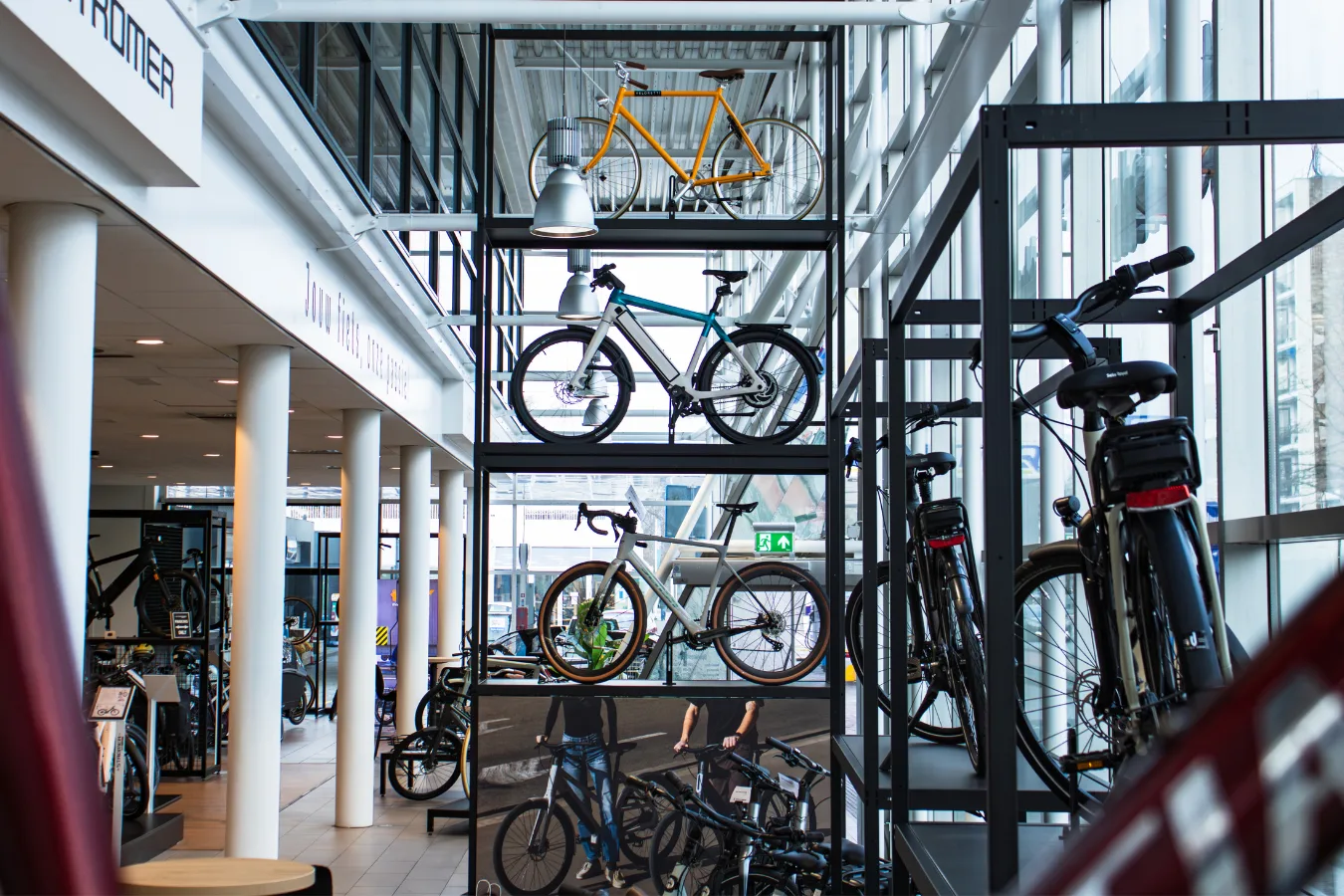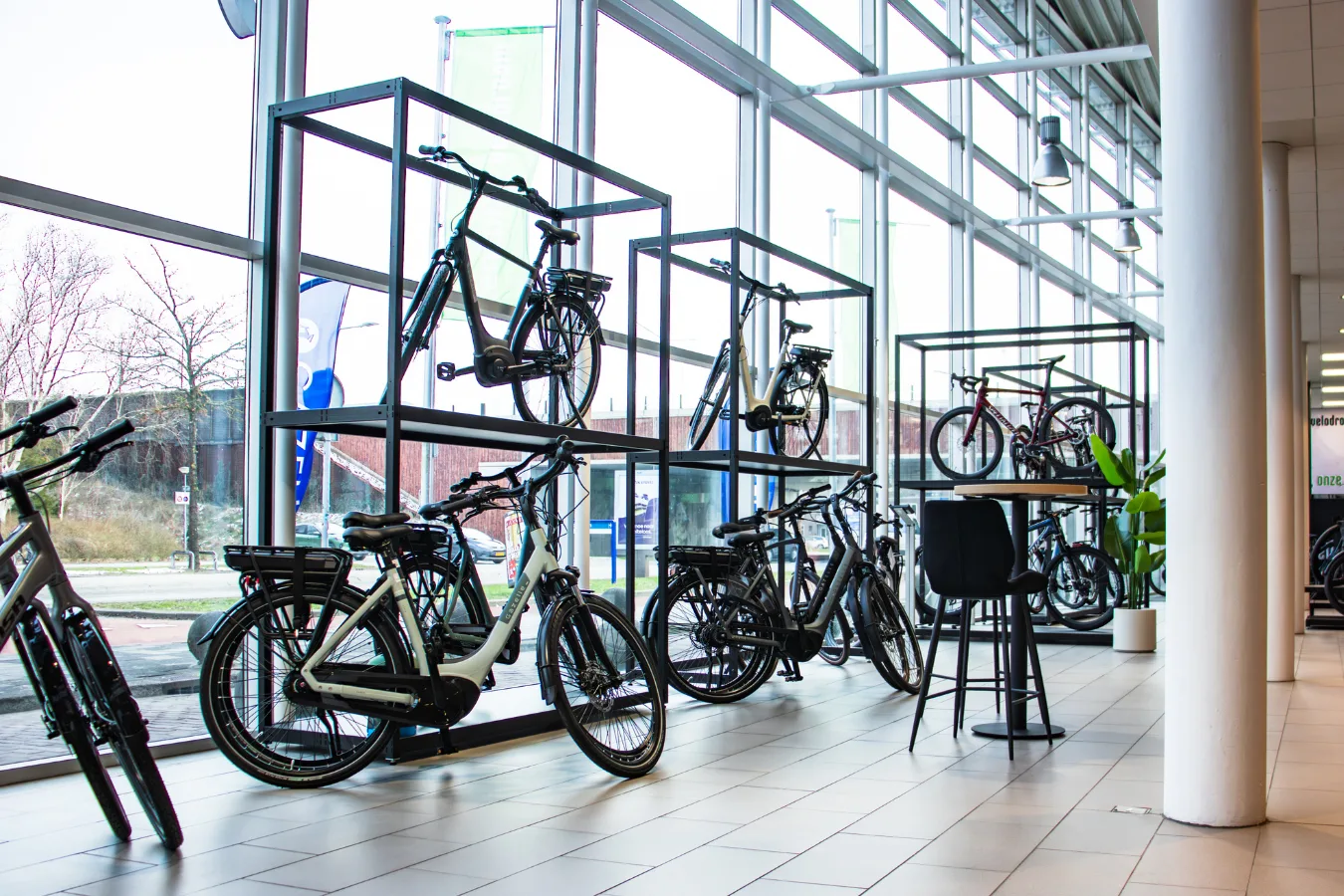 Met deze innovatieve frames kunnen we onze fietsen en accessoires strak etaleren, terwijl we in de winkel een mooi en rustig overzicht behouden. Precies de balans die we zochten tussen design en functionaliteit.